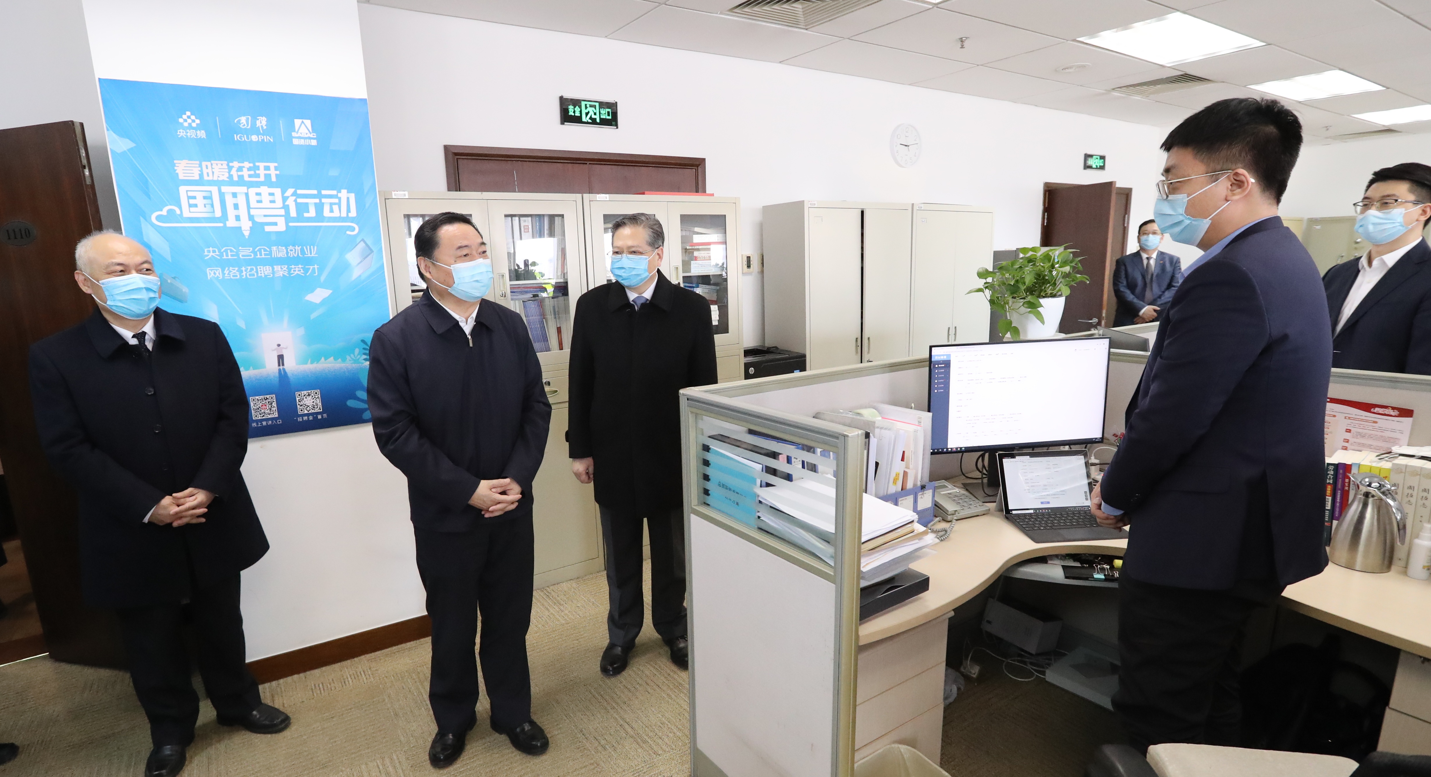 郝鹏首先来到国投人力资源服务公司,详细了解中央企业2020年春季大型网络招聘“国聘行动”进展情况,对企业适应疫情防控,勇担社会责任,推广网络“无接触式”招聘服务用人企业和求职者促进稳就业给予充分肯定,要求企业进一步做强做大招聘平台,聚合更多优质岗位资源,帮助更多高校应届毕业生和社会求职者顺利就业,助力稳就业和企业复工复产。接着,郝鹏与国投控股的梅河口市阜康酒精公司、新疆罗布泊钾盐公司视频连线,要求企业在做好疫情防控同时,提高产量、保证质量,生产更多酒精、钾肥等产品,保障疫情防控和春耕生产需要。